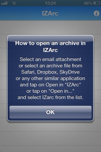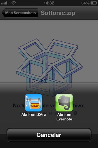 ¿Cómo funciona IZArc? El proceso es sencillo: seleccionar el archivo desde Safari, Dropbox, SkyDrive, Mail u otra aplicación similar, seleccionar la opción Open in y marcar IZArc.